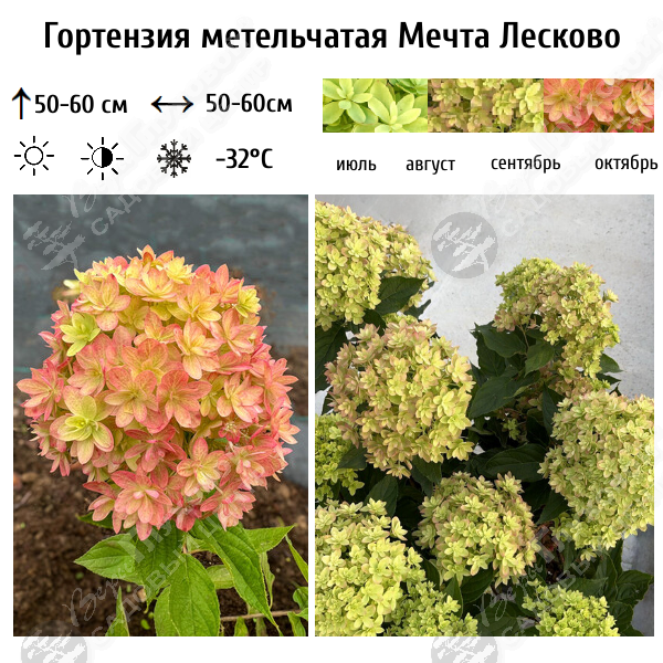Гортензия «Мечта Лесково»-компактный куст, высотой может достигать 50-60 см. Ширина куста 50-60см к 4-5 годам. Форма куполообразная, слегка раскидистая. Побеги прочные, жесткие, весной оливкового цвета, к осени становятся коричневыми. Лист зеленый, гладкий, не опушенный, ланцетовидной формы, 6-7 см длиной. Соцветие состоит стерильных махровых цветков, плотной, округлой, широкопирамидальной формы, размером 15-20 см. Цветение с середины июля и до середины октября. В начале цветения имеет оттенки палево-зеленого, затем появляется розовая кайма, которая постепенно заполняет весь лепесток, но серединка долго остается светло-зеленой. Во время цветения не выгорает. Морозостойкость до – 32 градусов, не требует укрытия на зиму.